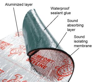 Partea de lucru a materialului de izolare fonică constă dintr-un strat de izolare fonică acoperit cu o membrană densă de izolare fonică. Stratul final aluminizat ne permite să obținem o aderență ridicată pentru următorul strat, pentru care recomandăm utilizarea unui absorbant de sunet moale. Obținem nu numai comoditate și ușurință în instalare, rezistență absolută la umiditate, elasticitate ridicată și aderență la suprafețe verticale, ci și, cel mai important, o ușurință fără precedent printre materiale similare, care ne permite să folosim materiale cu membrană pe acoperișul unei mașini.